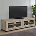Upgrade your entertainment space with this 79-inch TV stand, featuring a contemporary boxy silhouette and smooth surfaces. The distressed pine finish enhances its rustic appeal, while the glass-paneled cabinet doors add a refined touch. Adjustable shelves provide customizable storage for media devices, gaming consoles, and décor. The spacious tabletop supports TVs up to 85 inches, making it ideal for both stand-alone and wall-mounted configurations. Black metal legs and sleek black handles create a bold contrast, offering an industrial-inspired accent to any modern or farmhouse-style home.